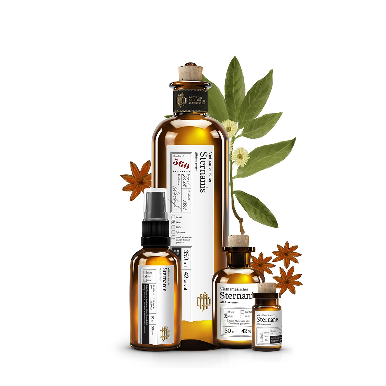 Ätherische Öle sind wesentliche Inhaltsstoffe, die einer Extraktion und Destillation mit Alkohol zugänglich sind. Ihre Zusammensetzung kann sehr komplex sein. Der quantitative Anteil eines einzelnen Bestandteils lässt jedoch keine Rückschlüsse auf seine Bedeutung für das Gesamtaroma zu. Will sagen, dass „viel hilft viel“ auch hier nicht gelten muss. Manchmal ist eine mengenmäßig gering vertretene Substanz viel wesentlicher für das wahrgenommene Aroma. Beim Sternanis hat sich die Natur aber in der Tat im Sinne des Sprichworts entschieden: sein ätherisches Öl besteht zum weitaus größten Teil aus trans-Anethol und es dominiert mit seinen anhaltend süßen und Lakritz-artigen, warm-kräuterhaften und würzig bis schwach…