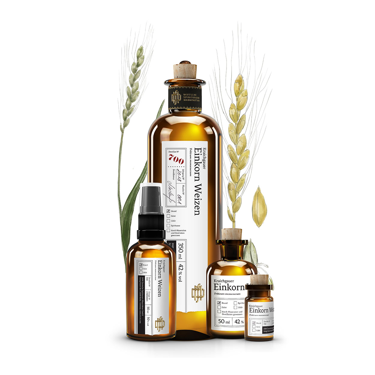 Einkorn wurde schon vor mehr als 8.000 Jahren in den Gegenden von der Türkei bis in den Nahen Osten domestiziert und zählt damit zu den ältesten Getreidesorten. Auch die letzte Mahlzeit von „Ötzi“, der etwa 5.300 Jahre alten Gletschermumie vom Tisenjoch, enthielt Einkorn. Das alles war – neben dem nussartigen Geschmack des Korns – für uns Grund genug auch aus dem Einkorn ein‘n Korn zu brennen. Wie bei allen Getreidesorten wird das in einer Schrotmühle fein gemahlene Korn zunächst mit heißem Wasser verkleistert, um die vorhandene Stärke freizusetzen. Anschließend werden natürliche Enzyme zugegeben wodurch man die sogenannte Süßmaische erhält, da…